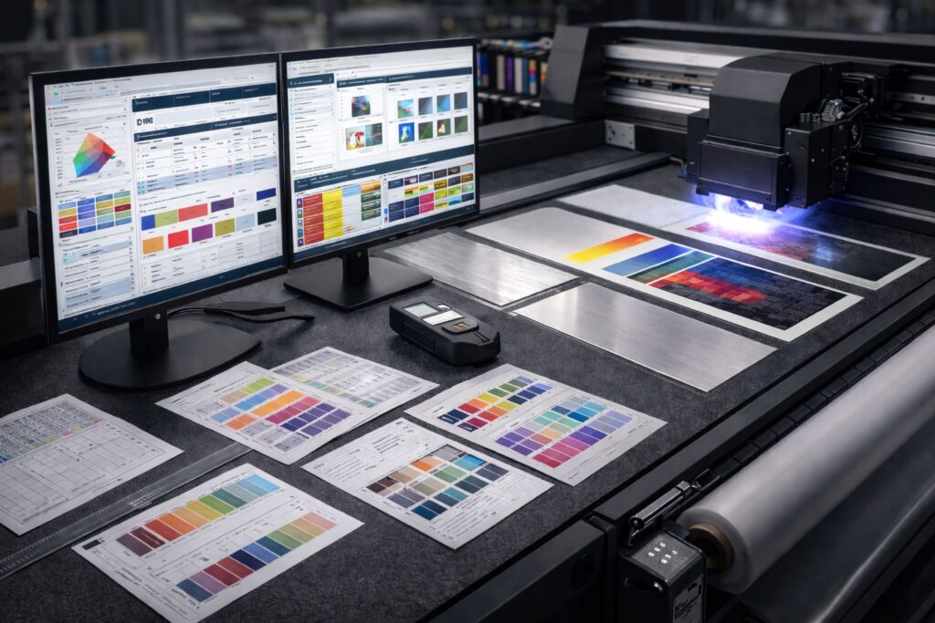 ICC profiles behave differently on aluminum versus acrylic when UV inks cure. We ran tests on brushed metal last week. The same color management engine produced three different blues across substrates. UV inks react to surface texture during the curing flash. Your ICC profiles must account for how heat changes color on rigid boards. Clear acrylic needs different curve adjustments than frosted plastic. Color management engine software calculates these differences before printing starts.