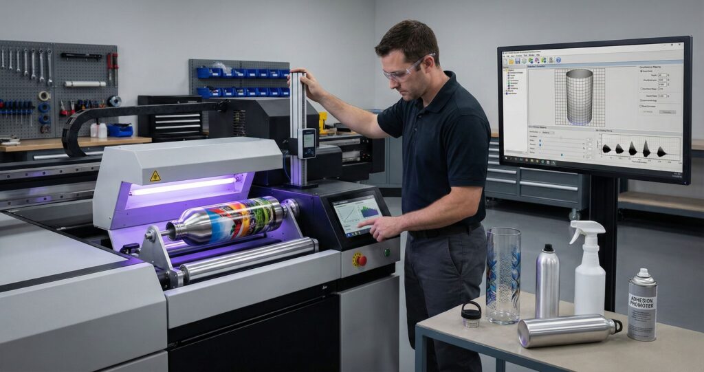 Circles become ovals and text looks wavy without proper compensation formulas built into the print workflow. We always run test prints on sample curves before processing client orders to verify distortion levels. Smart curved surface calibration turns a cylinder’s actual measurements into adjusted digital files that print perfectly when wrapped. This step happens before ink touches any surface during the setup phase.
