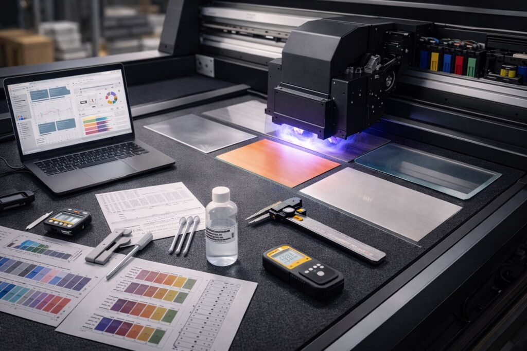 Adhesion strength varies wildly across material compatibility ranges. PVC accepts UV ink easily while metal surface prep. Surface energy determines whether ink bonds or beads up on glass substrates. We test adhesion by scratching cured ink with a fingernail after printing. Low energy materials reject ink during the curing cycle. Flame treatment raises surface tension on smooth plastics before printing starts.