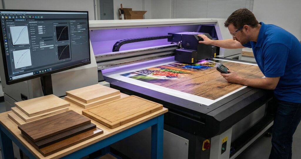 UV printing deposits specialized UV ink directly onto a wood substrate using advanced print heads. The magic happens in milliseconds. UV curing lamps instantly blast the freshly applied ink with ultraviolet light. This triggers instant polymerization which hardens the ink before it can soak into the wood fibers. The ink sits on the surface instead of penetrating deep into the material. We’ve tested this process on dozens of wood types, from oak to maple. The UV light locks the color in place almost instantly.